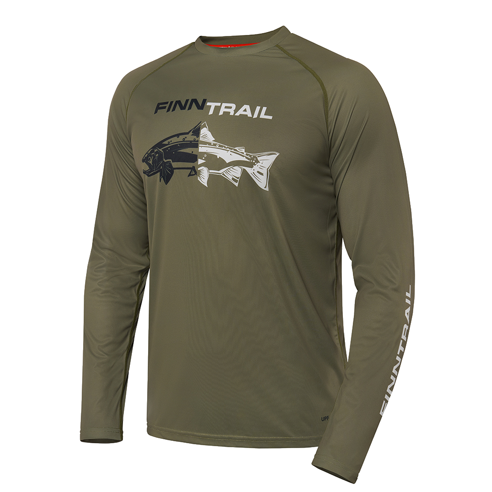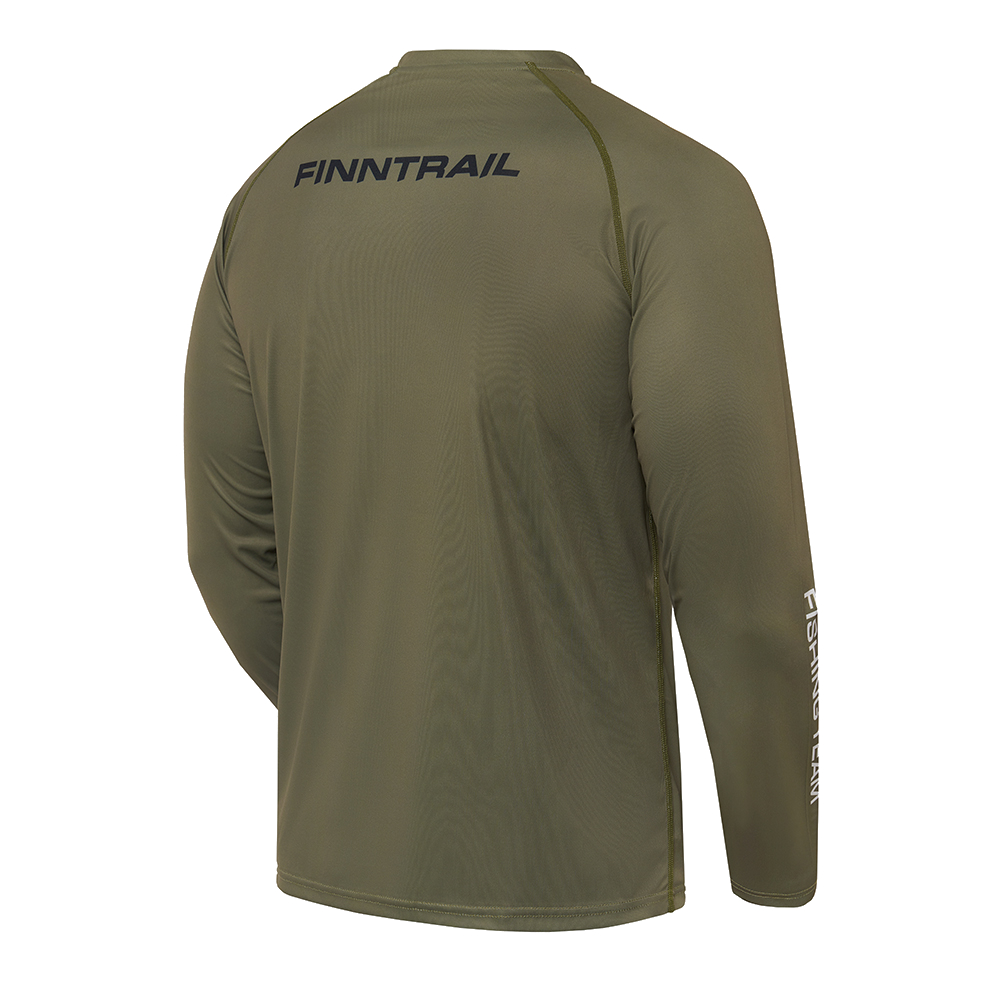 укроет от воздействия вредного солнечного излучения. Материал лонгслива изготовлен с использованием технологии от насекомых, а также обработан антибактериальным покрытием, препятствующим появлению неприятных запахов. Дизайн модели сочетает в себе классический цвет хаки, уникальный принт для любителей рыбалки с фирменным логотипом FINNTRAIL.