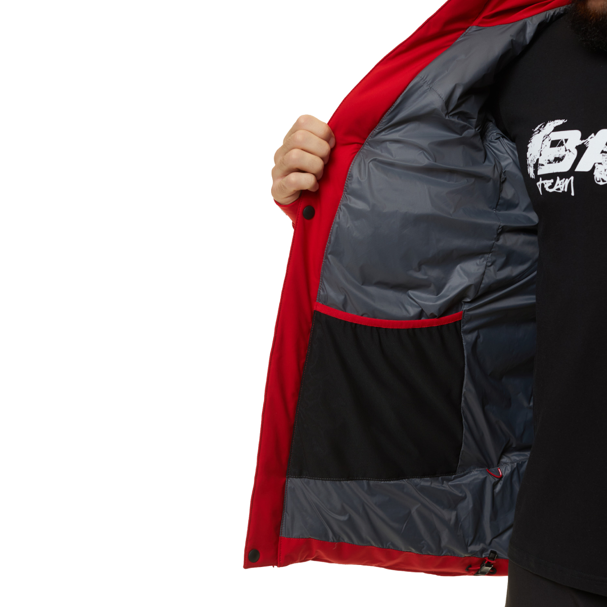 Усиленные вставки из синтетического утеплителя на плечах и локтях, регулируемые манжеты на липучке Velcro®, и фиксирующая петля для рукава добавляют функциональности. Боковые и нагрудный карманы на молнии доступны с рюкзаком, а внутренние карманы включают объемный из сетки и карман на молнии. Удлиненная спинка и эластичная регулировка по низу обеспечивают дополнительное тепло и защиту.