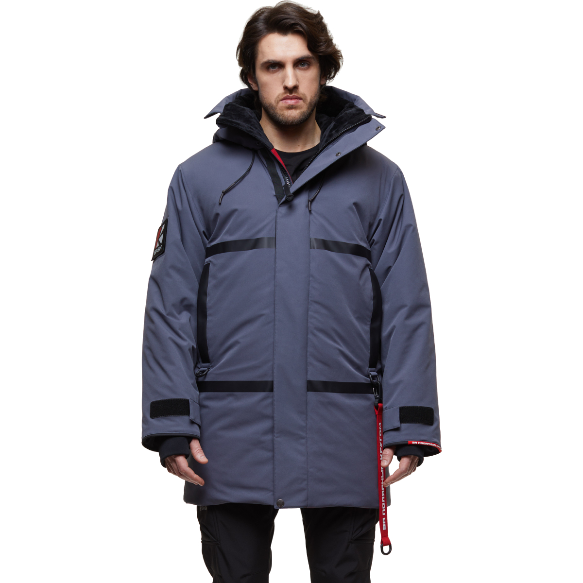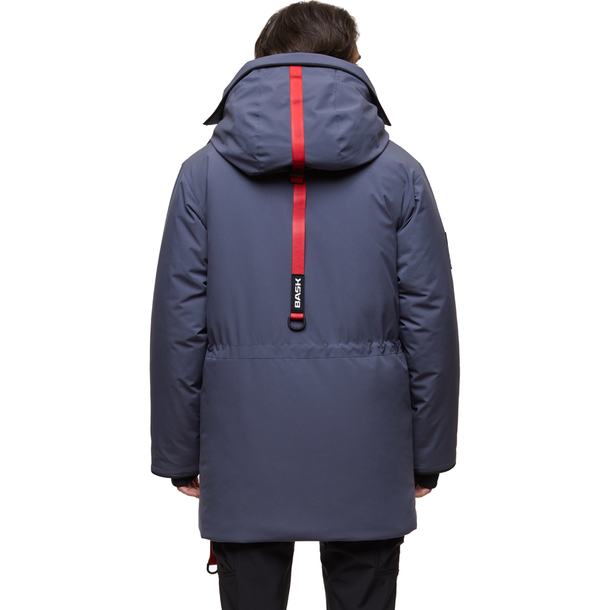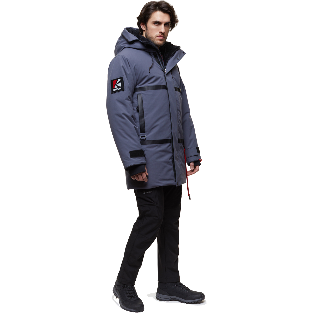 Куртка оснащена просторным регулируемым капюшоном и кулиской на талии для оптимальной посадки и защиты от холода. Регулируемые манжеты с дополнительными манжетами «под палец» и планка на кнопках защищают центральную молнию. Декор включает тёмные ленты на груди и карманах, а также функциональное брендирование, такое как съёмный световозвращающий брелок и комплект шевронов BASK ЗА ПОЛЯРНЫМ КРУГОМ на липучке.
