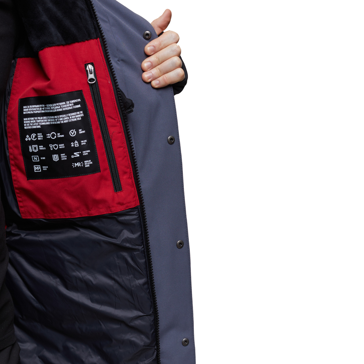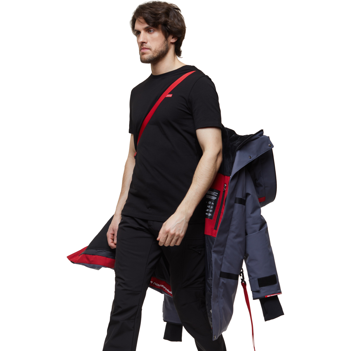 Куртка предлагает два тёплых внешних кармана и три внутренних кармана, включая карман под планшет. Съёмная стропа-лямка позволяет удобно носить куртку в помещении.