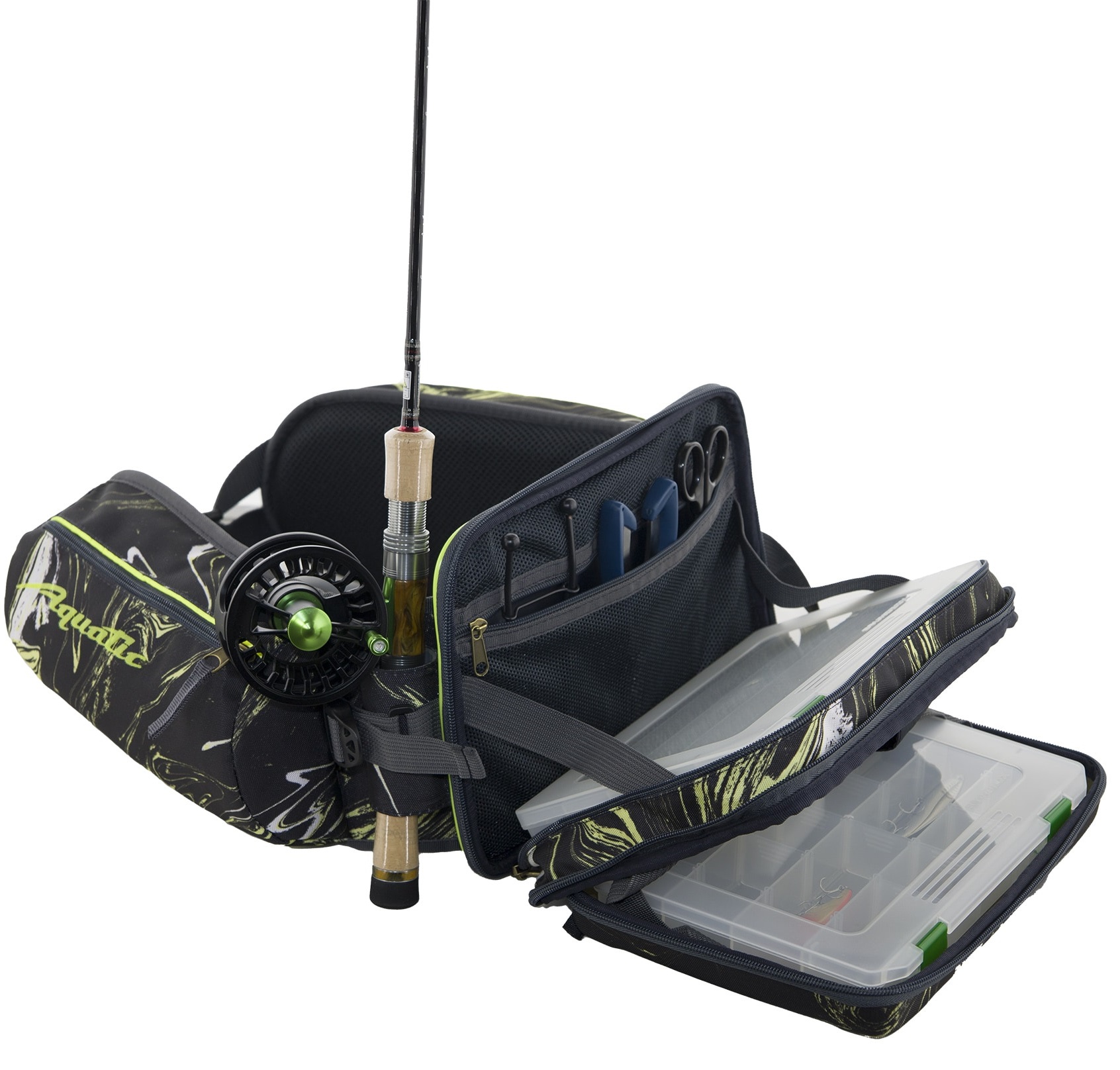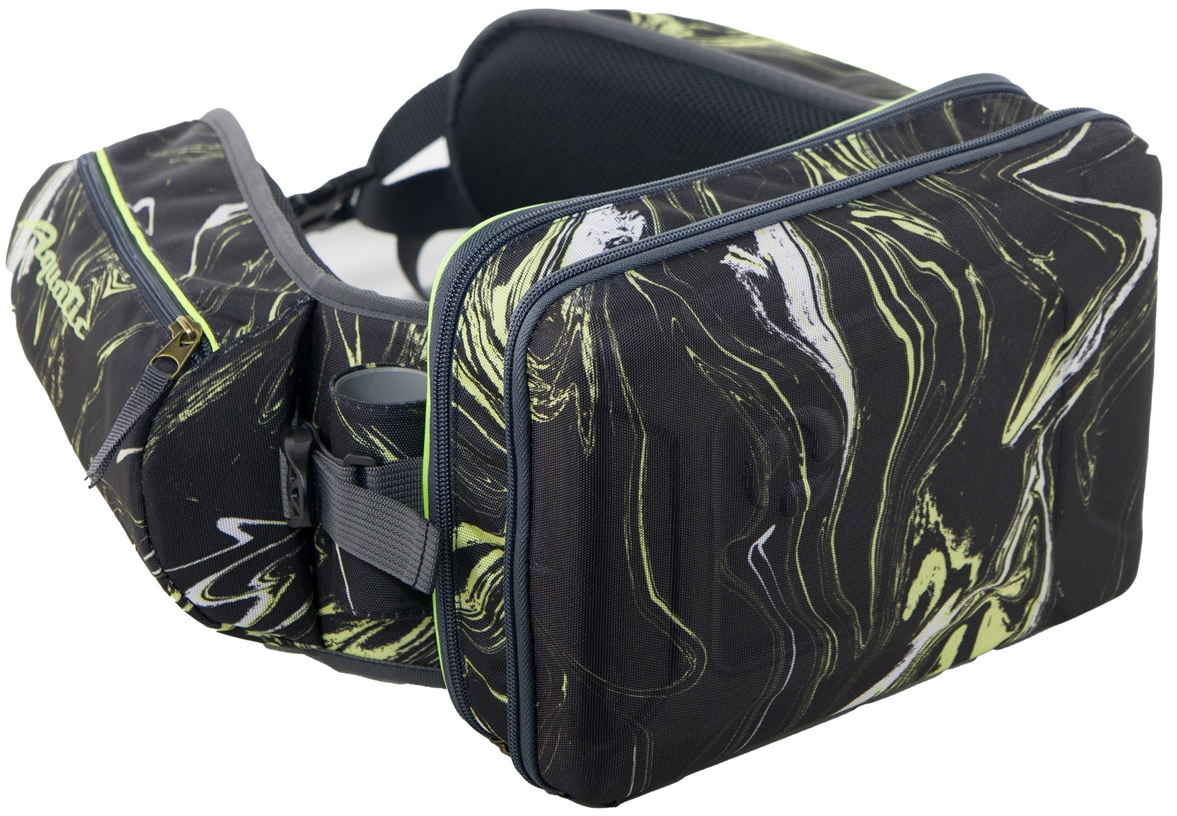 Задняя часть усилена пластиком. Комплектуется рыболовными коробками FB-250 (255x188x39 мм) и FB-250 SH (255х188х27 мм). Пояс имеет жесткий стакан для удилищ и два объемных кармана для аксессуаров. На поясе применены светоотражающие элементы. Жесткость самого пояса обеспечивает лист эвапоры, а мягкость специальный поролон с низким коэффициентом памяти и водопоглощения.