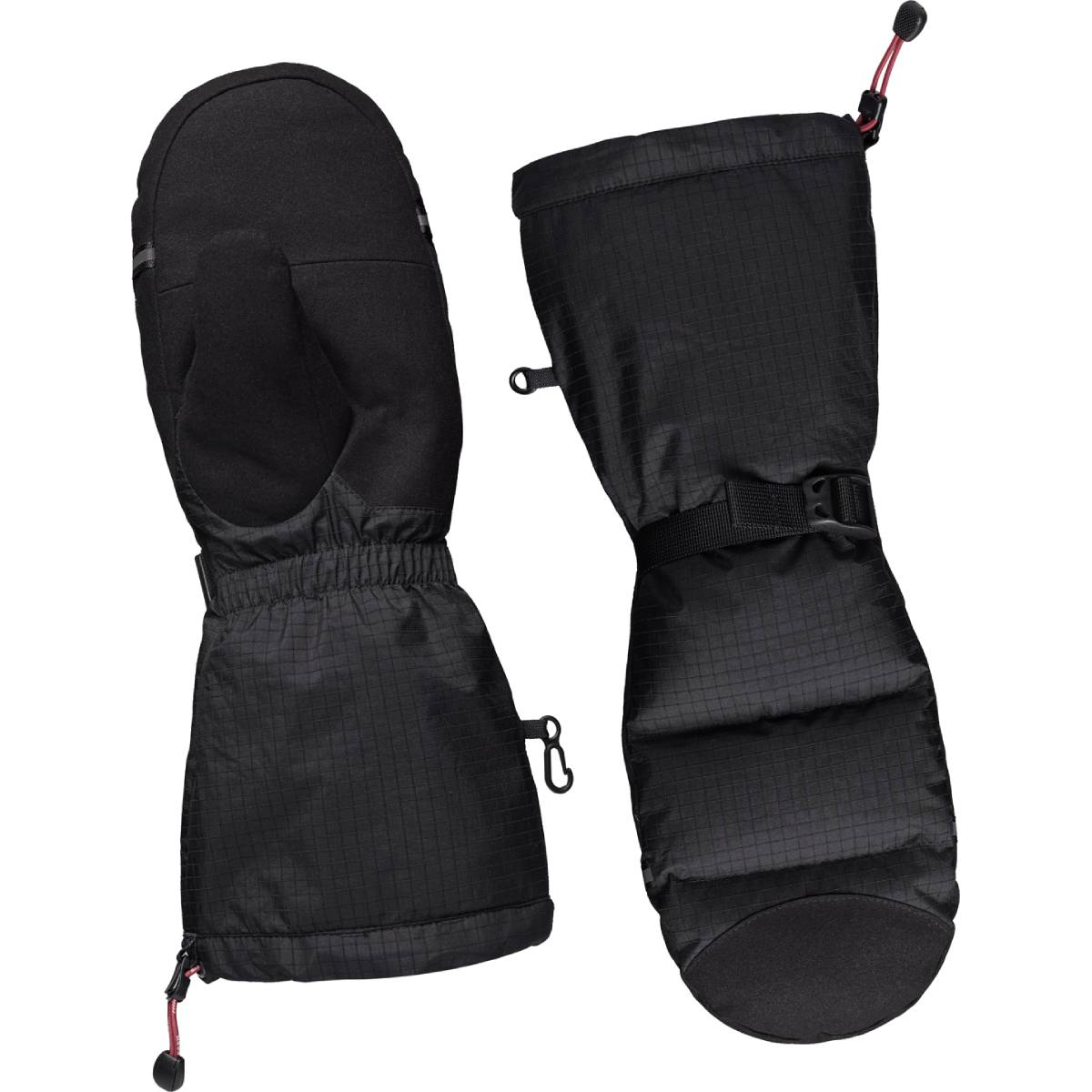 Ладони и большие пальцы усилены морозостойким материалом, что позволяет безопасно работать с верёвками и альпинистским снаряжением. Высокий утеплённый раструб с антистатической подкладкой дополнительно защищает от проникновения холода. Регулируемые утяжки на манжете и раструбе обеспечивают плотное прилегание к руке.
