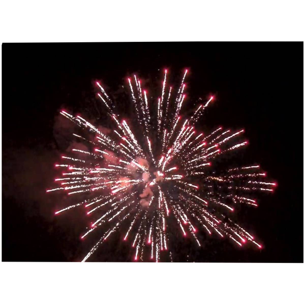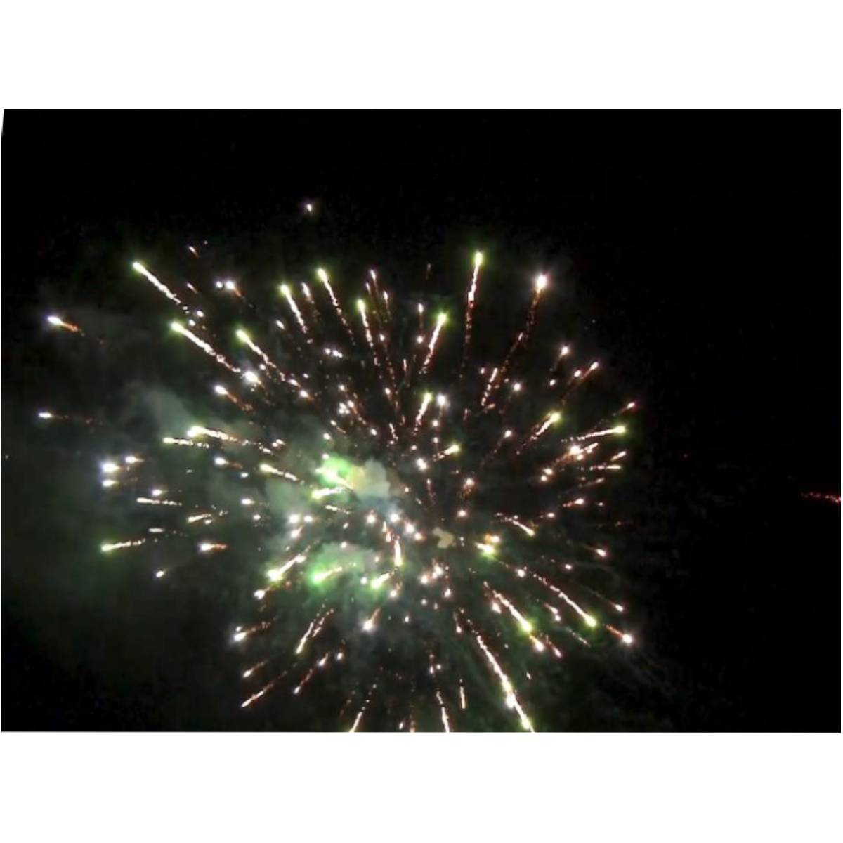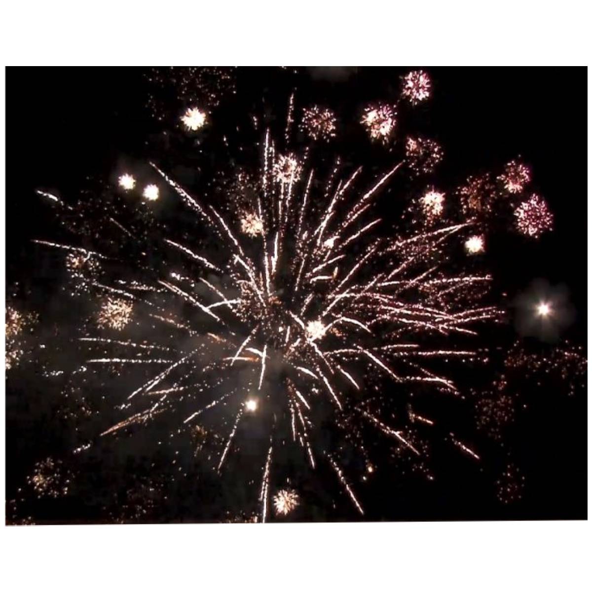 Красно-зелено-белая мерцающая сфера (пион) добавит динамики, а в завершение серебряные ниспадающие нити (парча) с облаком золотого треска (трещащая хризантема) создадут насыщенный и эффектный финал, наполняя небо зрелищным мерцанием.