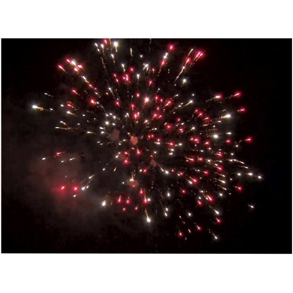 Затем множество золотых ниспадающих нитей (парча) наполнят небо сверканием, которое будет сопровождаться треском. После этого золотые хвосты с переходом в красные звезды (цветная хризантема) окрасит небо яркими огнями.