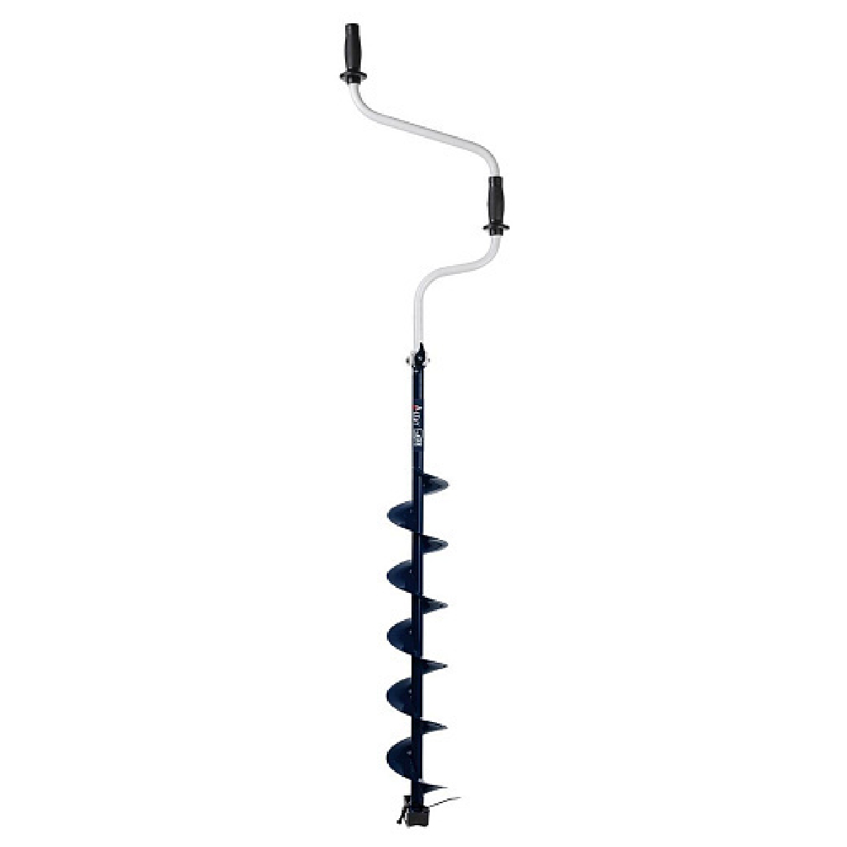 Особенность ледобура — смещенные рукоятки: верхняя на 130 мм, а нижняя на 150 мм от оси шнека. Это позволяет вращать ледобур двумя руками одновременно, что снижает физические усилия и увеличивает скорость бурения отверстий. Такая конструкция обеспечивает комфорт даже при продолжительном использовании.