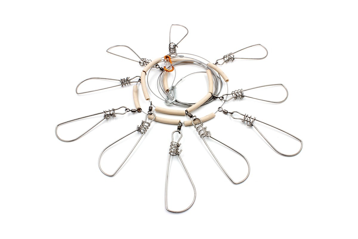 Надежные застежки на кукане предотвращают сорв рыбы и обеспечивают безопасную перевозку. Проволока, из которой изготовлен кукан, не боится укусов щучьих зубов, что делает его долговечным и надежным аксессуаром. Карабины на кукане закреплены при помощи вертлюгов на определенном расстоянии, что обеспечивает удобство в использовании. Силиконовые трубочки используются в качестве разграничителей, чтобы сохранить трофеи в хорошем состоянии во время перевозки. Кукан крепится к лодке (или к колышкам) с помощью надежных карабинов, обеспечивая надежную фиксацию.
