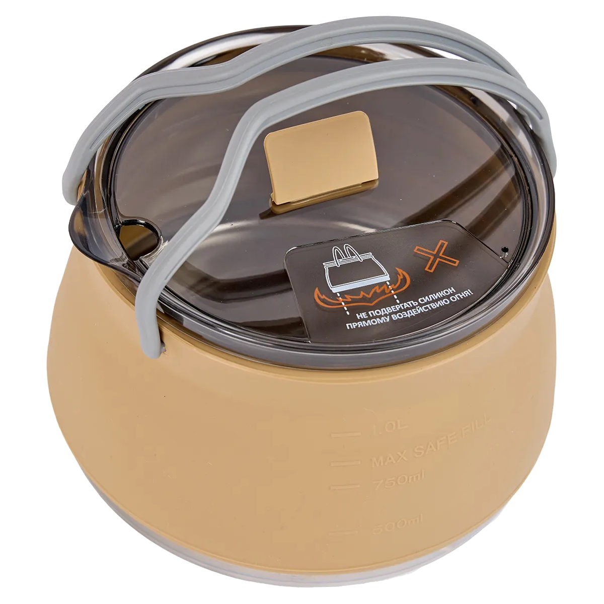 Силиконовый чайник с металлическим дном весит всего 260 г и занимает минимум места. Он выполнен из экологичного и безопасного для пищевых продуктов жаропрочного силикона.