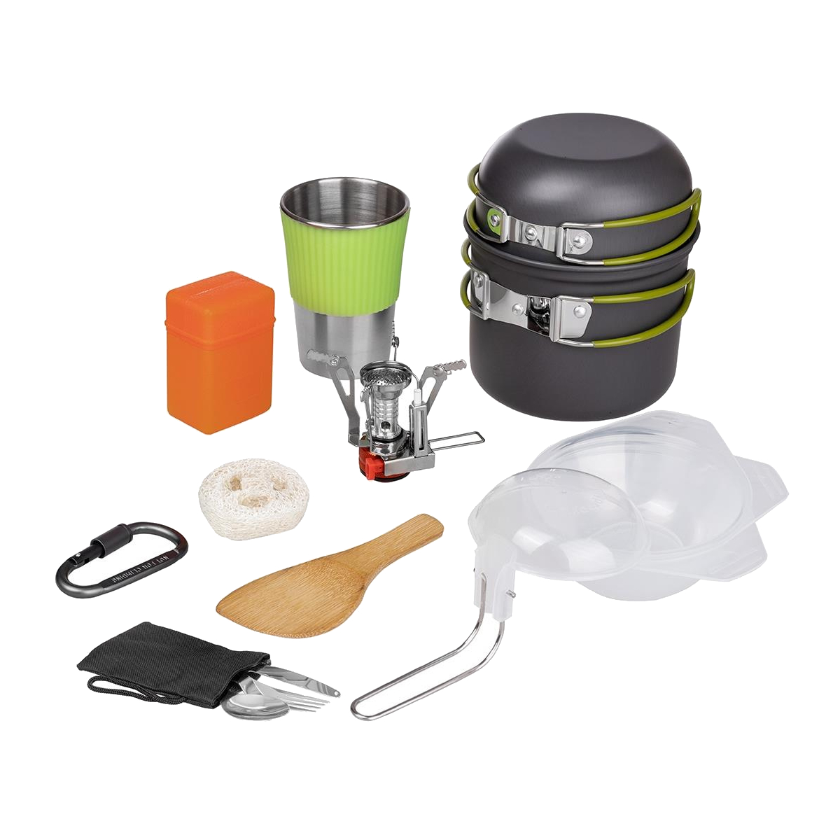 Посуда имеет откидные ручки с термоизолирующим покрытием, которые экономят объем при транспортировке, делая использование посуды более комфортным. Набор поставляется с нейлоновым мешочком для транспортировки и хранения.