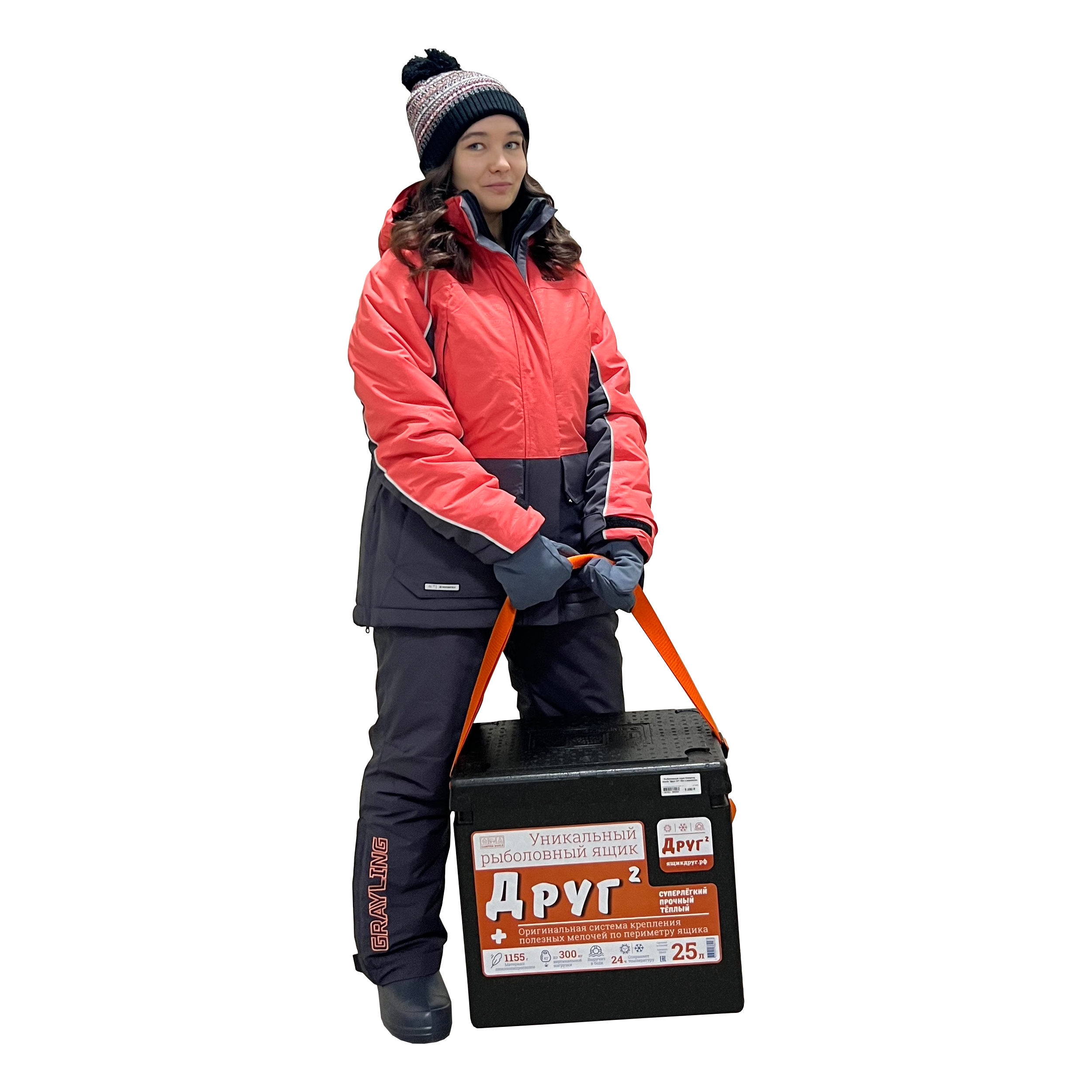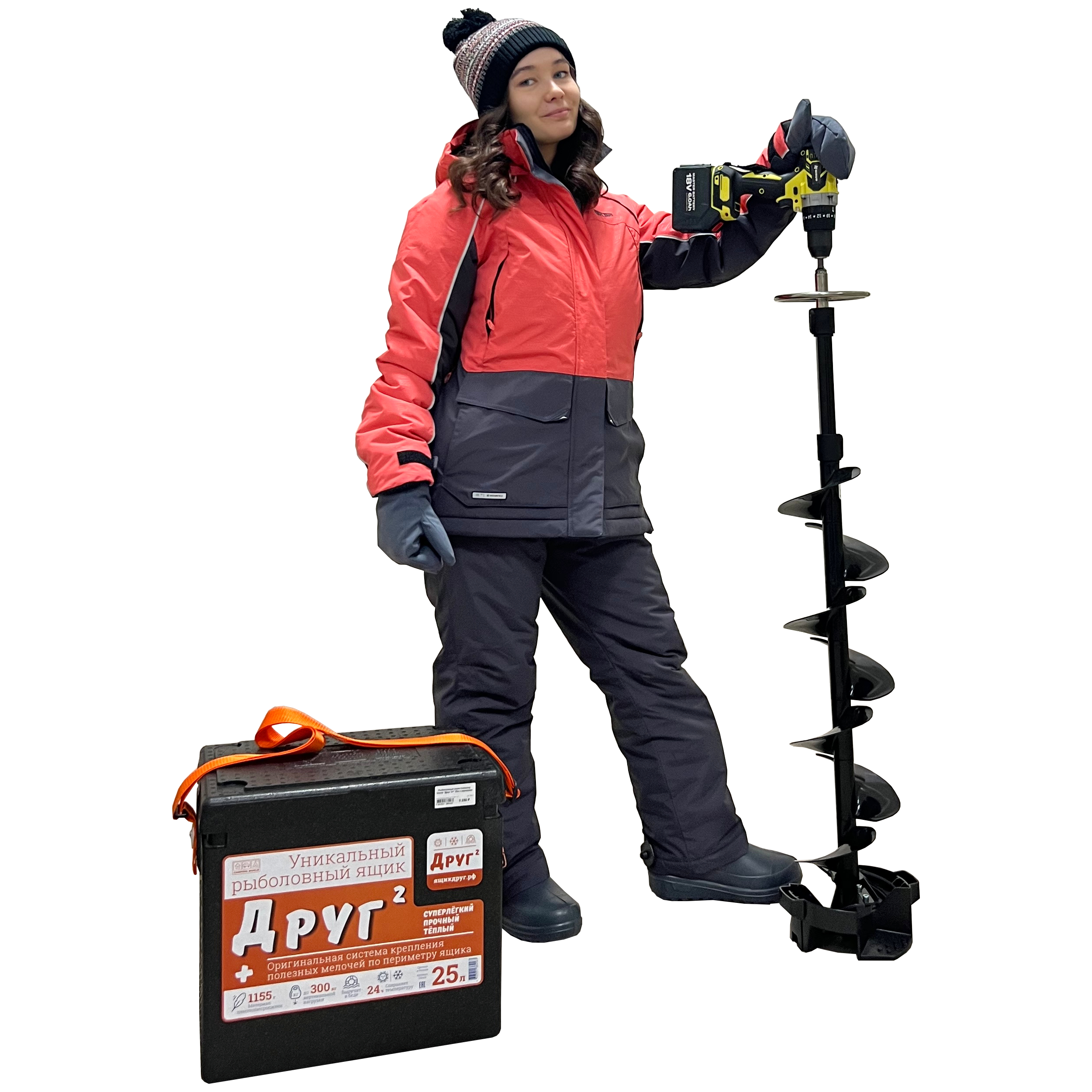 Рукавицы и сапоги с многослойной изоляцией выдерживают экстремальные морозы до -40°C, сохраняя тепло и предотвращая скольжение на льду. Вместительный рыболовный ящик на 25 литров позволяет удобно разместить снасти и пойманную рыбу, а также используется как сиденье.